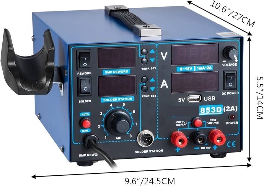 Yihua fen payalnik 853D elektronika təmiri və lehimləmə işləri üçün nəzərdə tutulmuş peşəkar kombinə edilmiş stansiyadır. Bu model isti hava feni və payalnik funksiyasını bir korpusda birləşdirərək həm SMD, həm də klassik lehimləmə işlərini rahat və dəqiq şəkildə yerinə yetirməyə imkan verir.